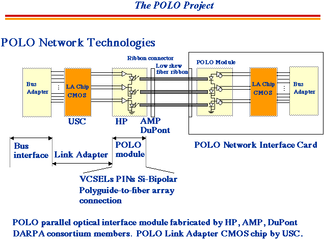 Within the consortium, Hewlett-Packard is responsible for developing the HP-POLO module. AMP and DuPont are providing optical connectors and waveguide technologies respectively. USC is developing a link adapter to interface the HP-POLO module to workstations. USC is also responsible for initial system integration, test and demonstration. POLO leverages the performance of Gb/s fiber-optic technology and multiplies it by ten using fiber ribbon. Ribbon fiber from Siecor is used for parallel data links over distances of a few meters to a kilometer. The HP-POLO module has ten Vertical Cavity Surface Emitting Lasers and ten receivers. The module uses Polyguide technology developed by DuPont and manufactured by AMP. AMP is also developing the Polyguide to fiber array connection. The assembled POLO module is a low-cost multi-Gb/s physical layer for advanced networks.
