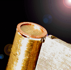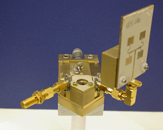 Fig.6 is the photograph of a 3 mm diameter and 0.4 mm thick LiNbO3 microdisk modulator with single prism coupling scheme. This modulator has an FSR of 14.6 GHz. The microdisk is mounted on a separate brass cylinder so the distance between the ring resonator and the microstripline and therefore the RF coupling coefficient is tunable. By optimizing the RF coupling coefficient in this configuration we can optimize the modulator sensitivity. Fig. 7 shows the results of sensitivity measurement for the 14.6 GHz microdisk modulator (Fig. 6). As may be seen in Fig. 7(a) the modulation reaches to the saturation point at 0 dBm RF input power. This shows a 10 dB improvement compared to the best reported result for a 0.15 mm thick microdisk modulator with an FSR of 9 GHz. Fig. 7(b) shows the spectrum of the detected power at –70 dBm (100 pW) RF input power with a signal-to-noise ratio of better than 11dB is measured. The modulation bandwidth is about 80 MHz
