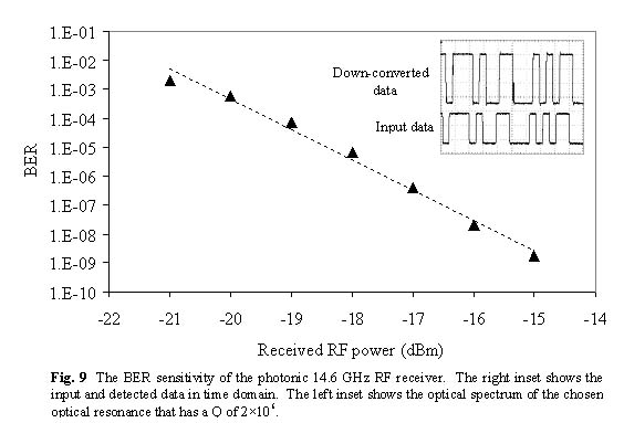 In our first experimental demonstration of photonic self-homodyne data down-conversion we use the 14.6 GHz microdisk modulator in the arrangement shown in Fig. 8. The laser source is a tunable single mode laser with 0.05 pm wavelength resolution and a linewidth of less than 0.5 MHz. The laser wavelength is always tuned to the minimum of the chosen transmission dip to maximize the second-order nonlinear modulation strength. The baseband signal is a 10 Mb/s 27-1 PRBS NRZ data stream mixed with a 14.62 GHz RF-carrier in a double-balanced RF-mixer. By DC-biasing the IF port of the mixer we can control the RF modulation index and magnitude of the transmitted power at carrier frequency. The RF signal is fed to the microdisk modulator through a bandpass RF filter with 1 GHz bandwidth around 14.5 GHz, to make sure that all of the nonlinear products generated in RF components are filtered out. The optical output is detected in a photoreceiver that has a bandwidth of 120 MHz and a sensitivity of –34.5 dBm. Fig. 9 shows the measured BER against the total RF input power. The left inset shows the optical spectrum of the chosen mode that has a Q of 2´106. The right inset shows the input and down-converted data in time domain.