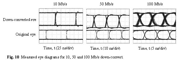 In Fig. 10 the measured eye diagrams at 10, 50 and 100 Mb/s are shown. The maximum data rate is limited by the optical Q of the chosen mode (»2-3´106) and is typically around 100 Mb/s.