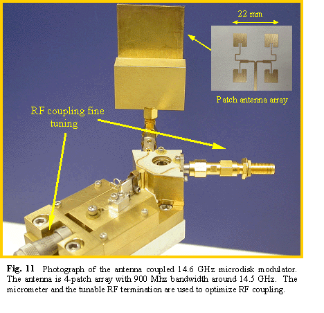 To demonstrate the performance of the photonic self-homodyne in an actual wireless link we have designed a narrowband four-patch antenna array that can be easily attached to the microdisk receiver. Fig. 11 shows a photograph of the antenna coupled microdisk receiver. We used a similar antenna patch array as the transmitting antenna to demonstrate a 10 Mb/s wireless link.