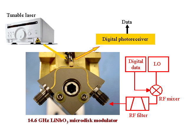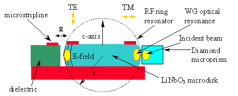 Microdisk optical modulator uses high-Q RF and microphotonic electro-optic resonators that are operated in simultaneous resonance. Fig. 3 shows the cross section of a typical LiNbO3 microdisk modulator. The optical resonator is a z-cut LiNbO3 microdisk with optically–polished curved side-walls. Standard evanescent prism-coupling is used to couple laser light into and out of a TE-polarized high-Q optical whispering-gallery (WG) resonance, which exists at the periphery of the disk. We use diamond microprisms for evanescent coupling element. The resonator's high optical-Q is used to increase the effective interaction length of photons with an applied RF electric-field. . An RF ring resonator fed by a microstripline is designed to overlap and be in simultaneous resonance with the optical field. When combined with a simultaneously resonant RF structure designed to provide voltage gain between the electrodes, a highly sensitive modulator at microwave frequencies is, in principle, achievable. The free spectral range (FSR) of the optical resonator is the center modulation frequency of the optical carrier. The frequency of the RF carrier fRF should be an integral multiple m of the optical FSR such that f0 = 1 / tdisk = nopt2pR / c where tdisk is the optical round-trip time of the disk and R is the disk radius.