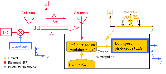Fig. 2 Schematic diagram of the photonic self-homodyne RF receiver. The transmitted carrier RF signal is received by the antenna and is directly fed to a square-law optical intensity modulator. Through nonlinear optical modulation the optical output intensity spectrum contains the baseband and high frequency components that are filtered out by the response of the low-speed photodetector.
