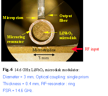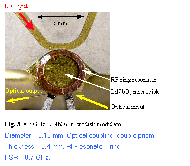 Fig.5 is the photograph of a 5.13 mm diameter and 0.4 mm thick LiNbO3 microdisk modulator with double prism coupling scheme. This modulator has an FSR of 8.7 GHz. The microdisk is mounted on the same substrate as the microstripline therefore the distance between the ring resonator and the microstripline is fixed.