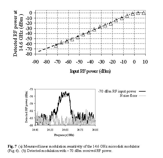The key innovation in the photonic RF-receiver is replacing the function of a single-ended diode or FET mixer in a transmitted carrier wireless link with a sensitive resonant optical modulator that performs down-conversion in the optical domain. In this approach the nonlinear dependence of the modulator’s transmitted optical power (Pot) on applied RF voltage (VRF) is the source of nonlinearity in the system. Fig.1 shows how tuning the laser wavelength to a transmitted resonant dip of the microdisk optical modulator results in square-law operation where Potµ VRF2. The constant of proportionality is determined by the sensitivity of the microdisk modulator and the amount of coupled optical power.