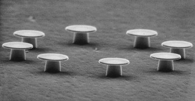microdisk lasers supported by InP posts on an InP substrate. Disks are 2 um